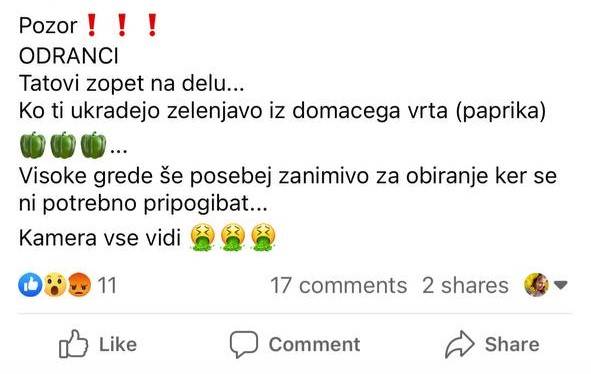 Visoke grede še posebej zanimivo za obiranje, ker se ni potrebno pripogibat ... Kamera vse vidi,« je zapisal eden izmed uporabnikov Facebooka, ki opozarja na tatvine zelenjave v Odrancih.