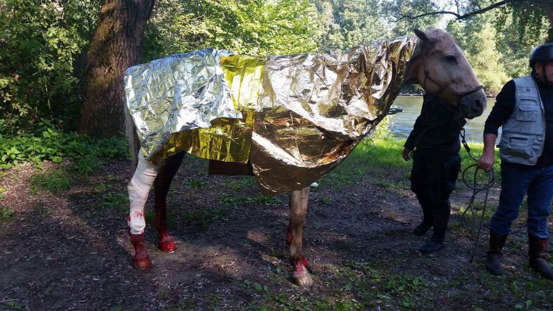 Kot je razvidno iz fotografij si je konj ob padcu poškodoval noge, zato so ga primerno oskrbeli in pokrili s folijo, ki zmanjšuje toplotno ohlajanje telesa.