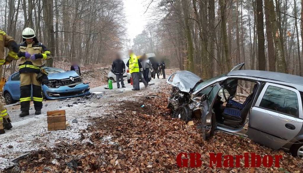 Iz Uprave Republike Slovenije za zaščito in reševanje so sporočili, da sta nekaj minut pred četrto uro popoldne na cesti na Kočkem vrhu, občina Sveti Jurij ob Ščavnici, trčili osebni vozili. Posredovali so gasilci PGD Gornja Radgona in JZZPR Maribor, ki so zavarovali kraj dogodka, odklopili akumulatorja in s tehničnim posegom rešili ukleščeni osebi ter nudili pomoč reševalcem NMP Gornja Radgona, ki so tri poškodovane osebe na kraju oskrbeli in jih prepeljali v nadaljnjo oskrbo v murskosoboško bolnišnico.