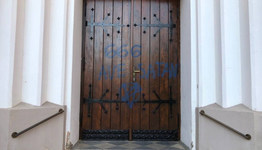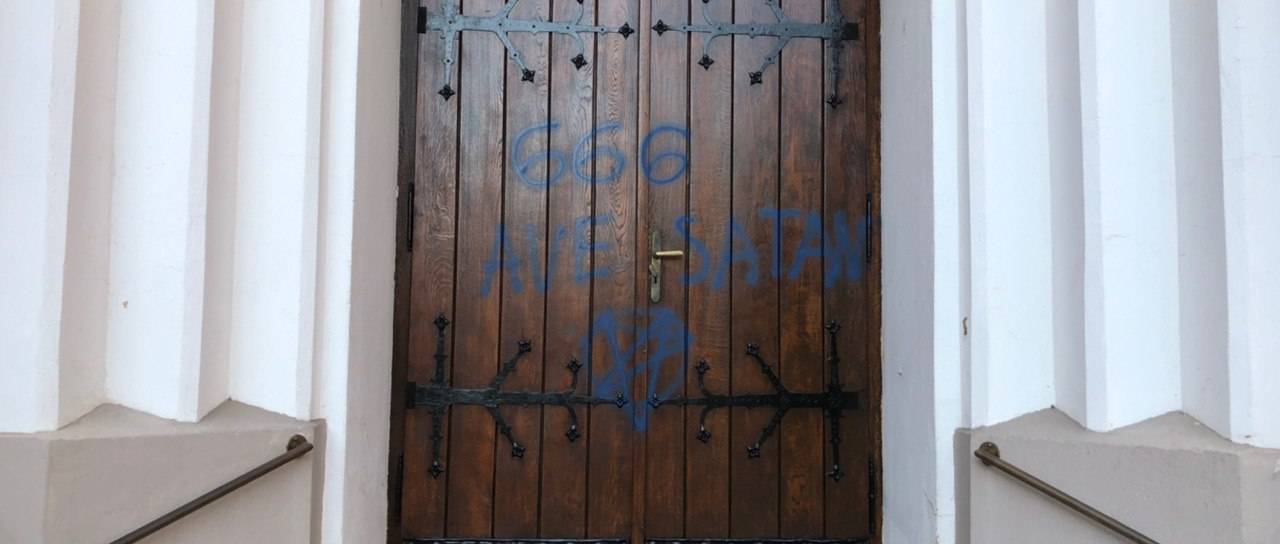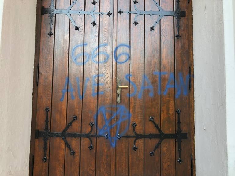 Z modro barvo so na vrata cerkve zapisali »Ave satan«, številko 666, ki sicer velja za hudičevo število in pentagram.