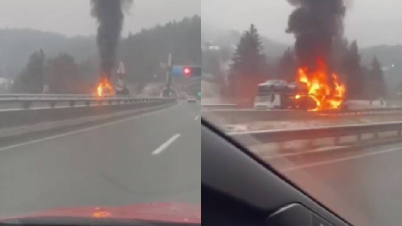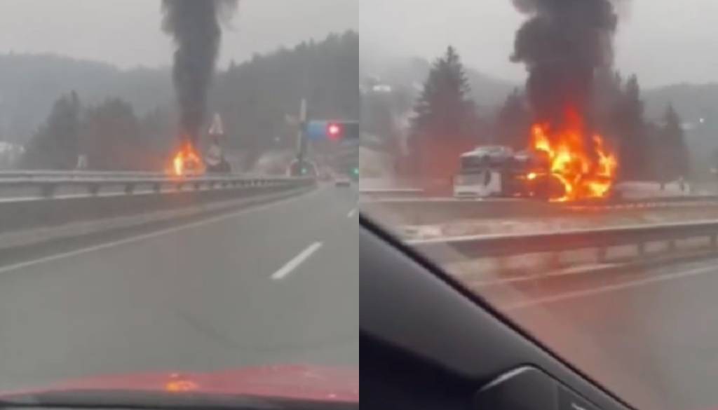 VIDEO: Goreče vozilo za več ur zaprlo avtocesto, zagoreli avtomobili na priklopniku