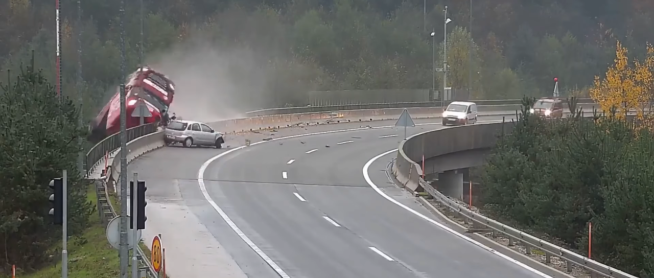 Prometna nesreča se je zgodila včeraj malo po 8. uri, ko je osebno osebno vozilo v levem preglednem ovinku na mokri cesti zaneslo na desno, pri čemer je trčilo v tovorno vozilo. Voznik tovornega vozila je skušal reševati položaj tako, da je zapeljal desno na odstavni pas, pri čemer pa je tovorno vozilo trčilo v obe varovalni ograji in se prevrnilo čez. Padlo je okoli 20 metrov globoko v globel pod viaduktom, pri čemer je voznik umrl ukleščen v kabino.