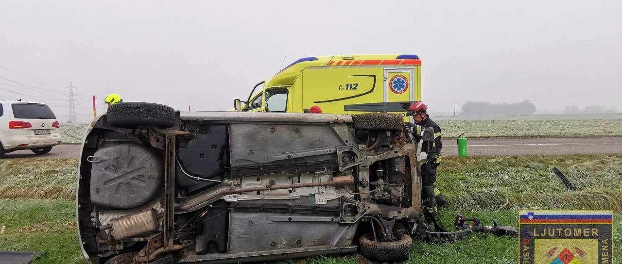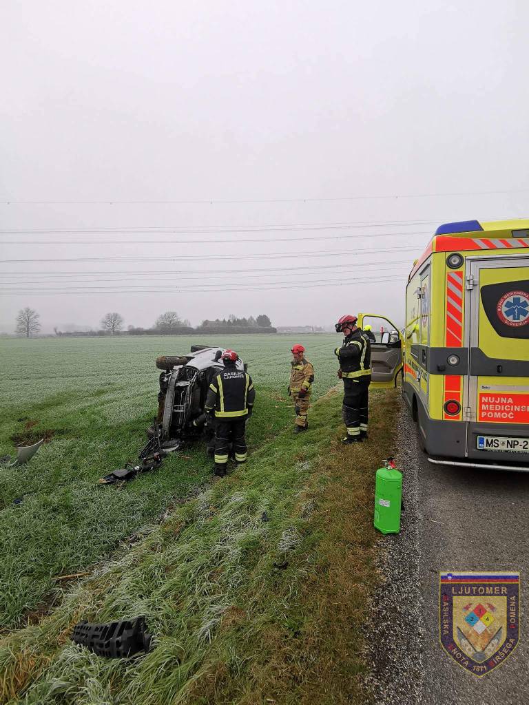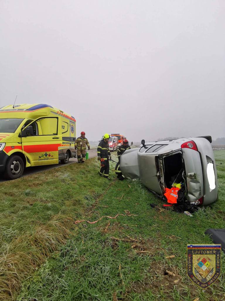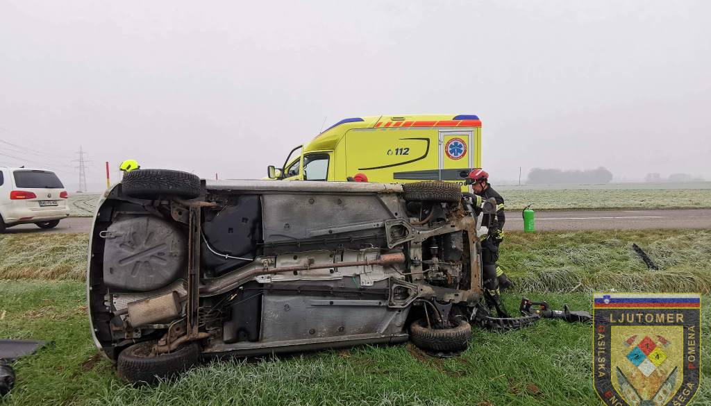 Na cesti Ljutomer–Krapje je s cestišča zdrsnilo osebno vozilo in se pri tem prevrnilo na bok. Na pomoč so priskočili gasilci Prostovoljnega gasilskega društva Ljutomer, ki so zavarovali kraj dogodka, odklopili akumulator in poškodovani osebi pomagali iz vozila.