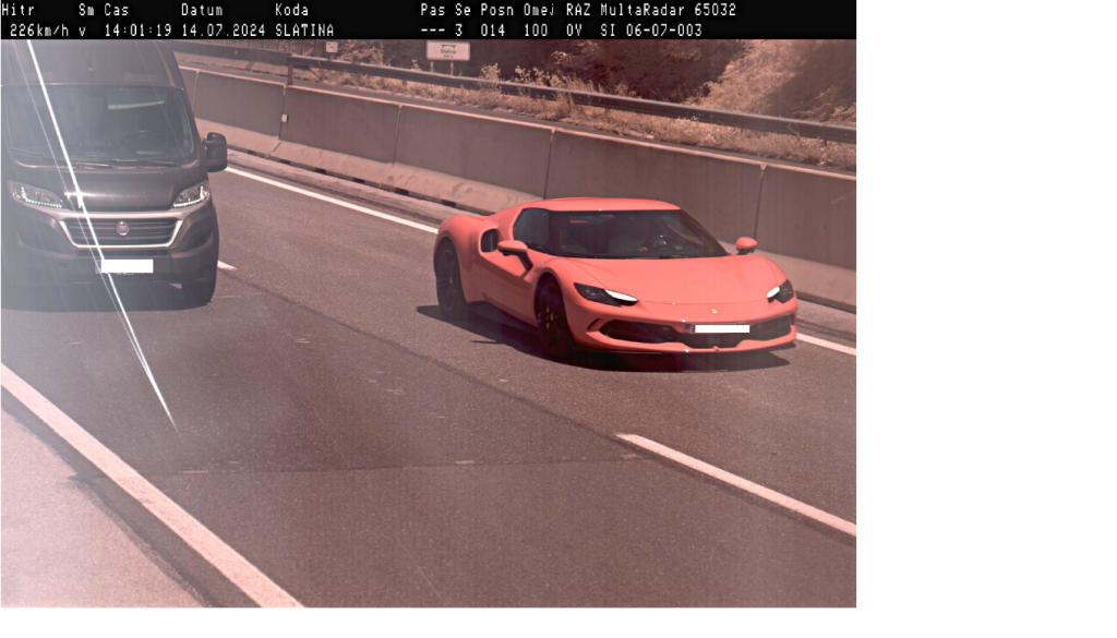 Voznik Ferrarija je na avtocesti, kjer je hitrost vožnje s prometnim znakom omejena na 100 kilometrov na uro, vozil s hitrostjo 226 kilometrov na uro. Kršitelju so poleg globe v višini 1.200 evrov izrekli še devet kazenskih točk.
