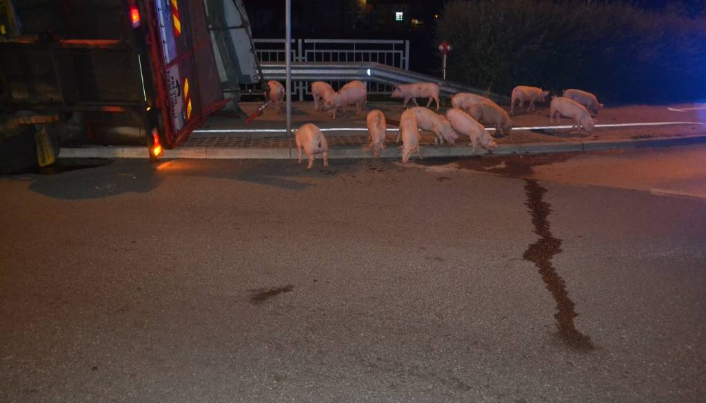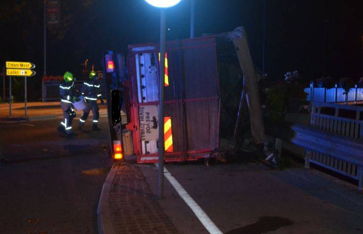Voznik, ki je v tovornem delu prevažal okoli 60 prašičev, je pri vožnji skozi krožišče zapeljal na del krožišča ob fontani, zaradi česar se je vozilo prevrnilo in zdrselo proti mostu.