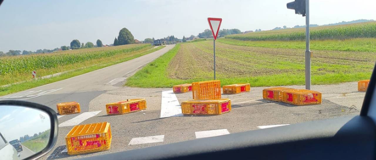 Sredi ceste, in sicer v križišču Lipovci - Bratonci, so raztresene plastične škatle za kokoši, nekatere so celo polne.