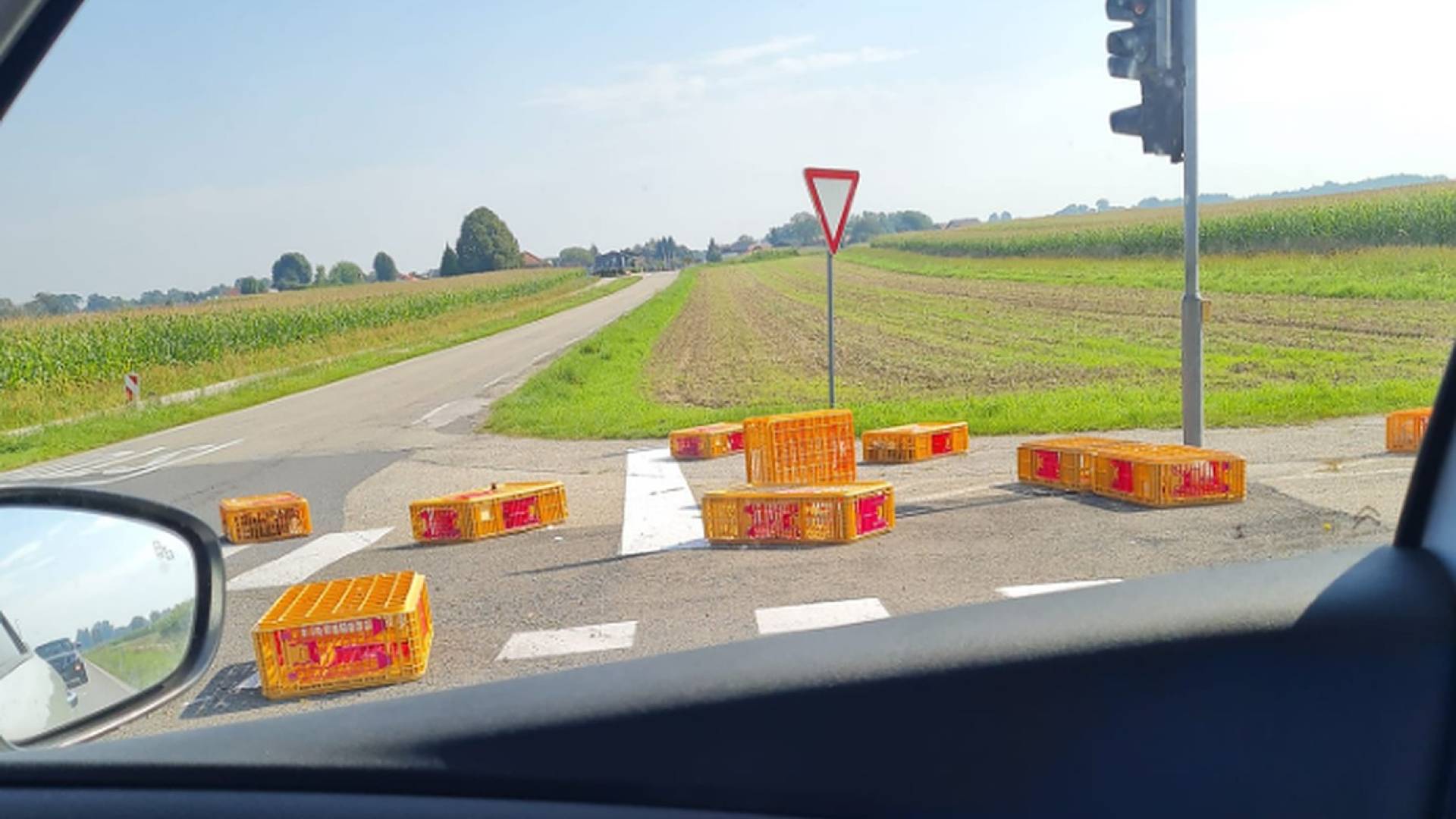 Sredi križišča ležijo plastične škatle s kokošmi.