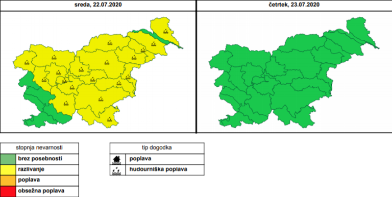 Ob lokalnih nevihtah z nalivi lahko hitro in močneje narastejo manjši vodotoki in hudourniki, ob tem so možna tudi razlivanja. V četrtek se bo vodnatost po državi postopno zmanjševala, ob nevihtah pa tudi jutri popoldne lahko izraziteje narastejo manjši vodotoki. Ponovno naraščanje rek pričakujemo v petek.