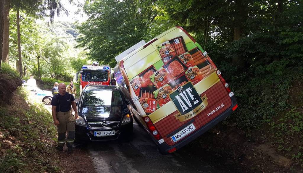 Do nenavadne prometne nesreče je prišlo v petek popoldne v naselju Grabe v občini Apače, kjer sta se na izjemno ozki cesti zagozdila avtomobil in kombinirano vozil. Voznik kombiniranega vozila se je ob srečanju sicer poskušal izogniti trku, zaradi česar je zapeljal v klančino ob cesti, a sta se vozili kljub temu najprej oplazili, nato pa zagozdili. K sreči v prometni nesreči ni bil poškodovan nihče.