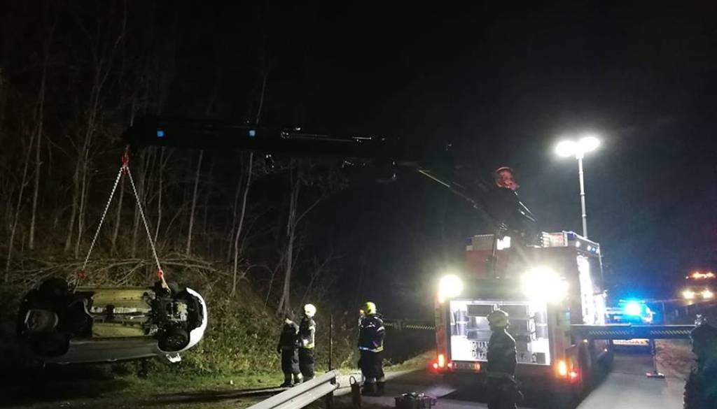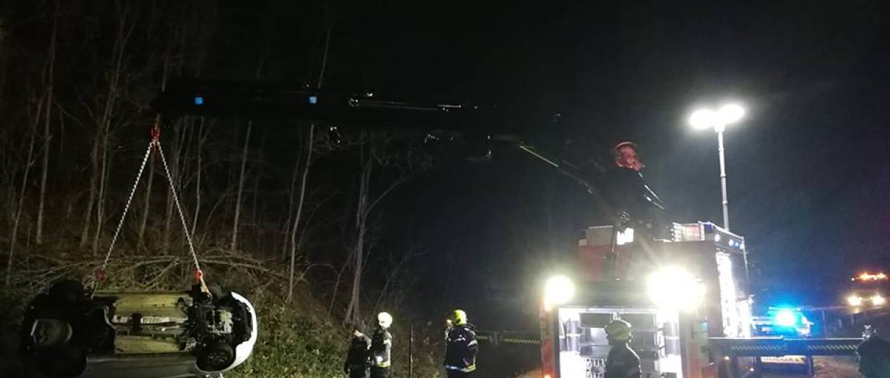 Ob 18.47 je pri naselju Mekotnjak osebno vozilo zdrsnilo s cestišča in se prevrnilo na streho, pri čemer je voznik ostal ukleščen v avtomobilu.