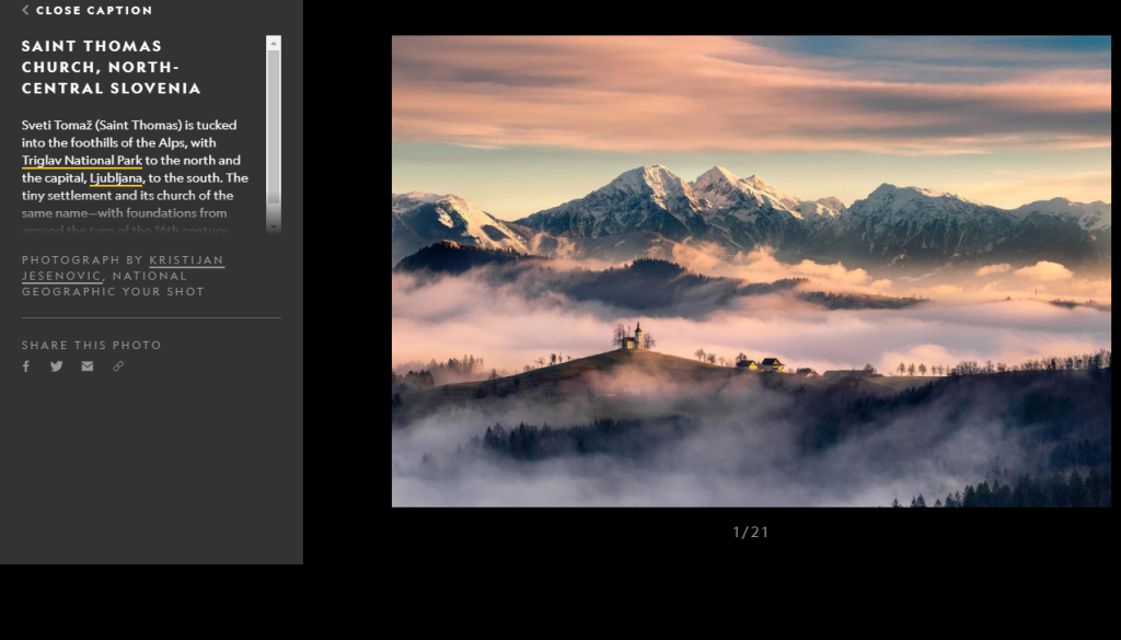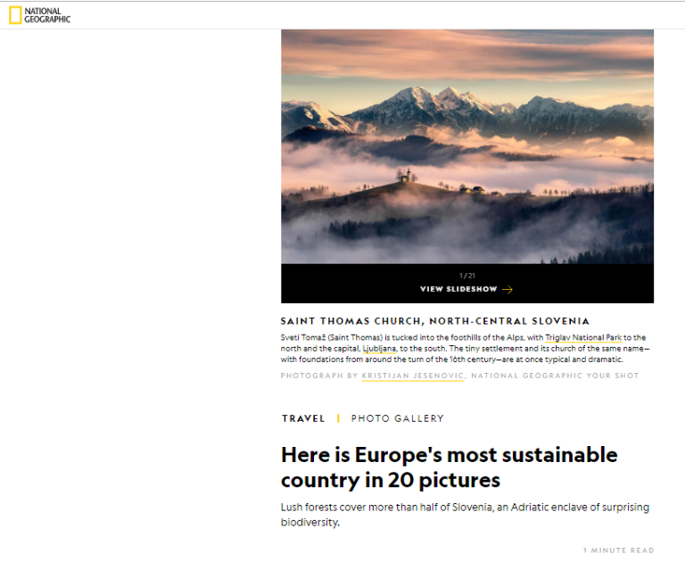 V galeriji, posvečeni 'najbolj trajnostni državi v Evropi', si na nationalgeographic.com lahko ogledamo njegov čaroben utrinek Svetega Tomaža s cerkvijo na hribu, v meglicah oziroma nizki oblačnosti. Kot pojasnjuje Jesenović, sicer tudi član Foto-video kluba Lendava z vrsto priznanj s področja fotografije, mora vsak avtor na prošnjo National Geographica tudi potrditi izvor fotografije.