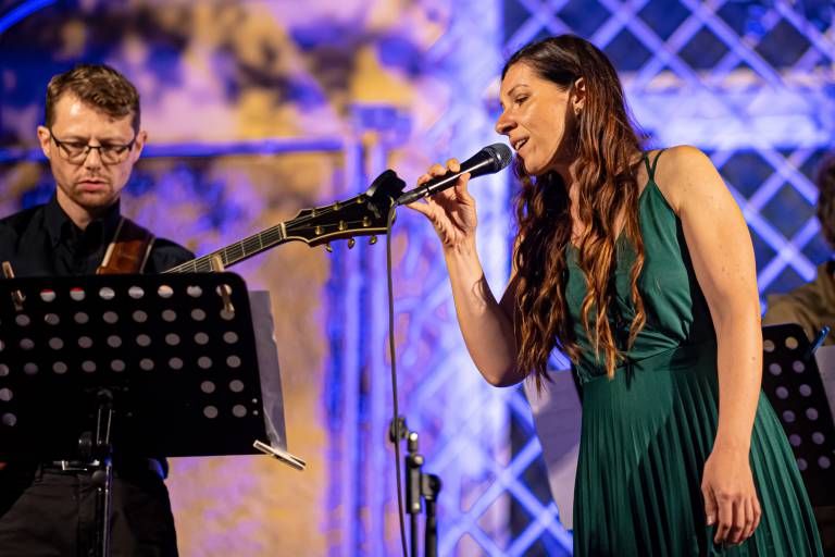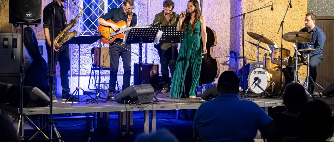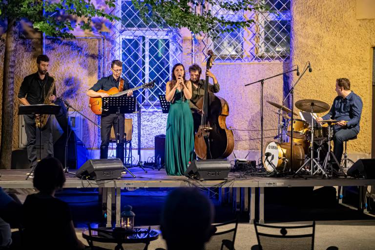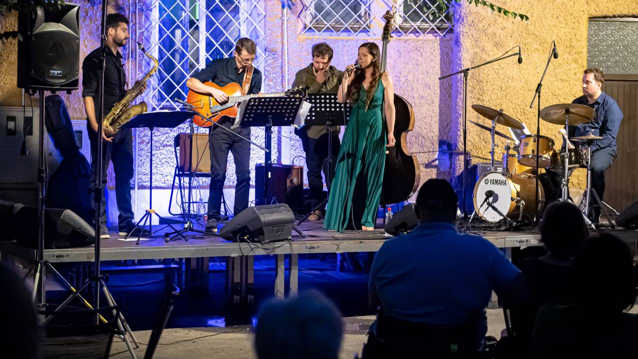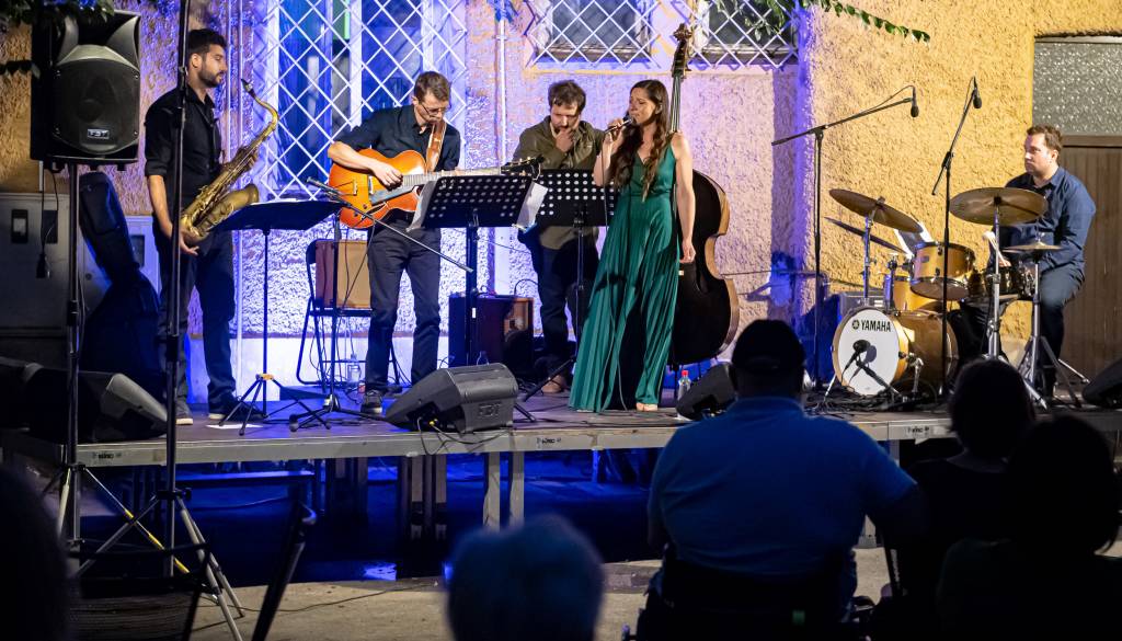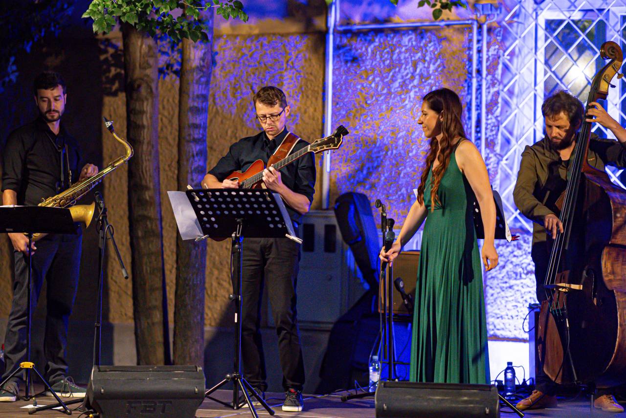 Na Skritem dvorišču pa se je tokrat predstavila skupaj z odličnimi glasbeniki in prijatelji, s katerimi je svojo jazzovsko pevsko pot tudi začela. In sicer na odru so se ji pridružili Stane Hebar s kitaro, Luka Gaiser s kontrabasom, Gregor Zver s saksofonom in Jože Zadravec na bobnih.