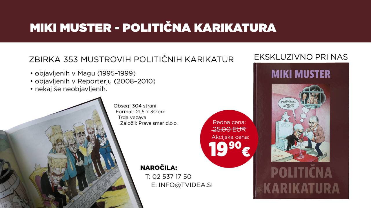 Miki Muster je risal tudi politične karikature. Sprva za popestritev sten svoje delovne sobe, kasneje tudi za revijo Mag. Mustrove politične karikature so nekaj najbolj zamolčanega v njegovi biografiji. V svojem življenju je dal nešteto intervjujev, pa ga skorajda nihče ni vprašal o tem njegovem izvrstnem delu. Njegova politična karikatura je precej neprizanesljiva tako v svoji elementarni risbi portretiranca, v kateri ne izstopajo le fizične, ampak tudi bolj psihološke značilnosti, kakor tudi v posebnih dodatkih v ozadju, ki portretiranca umeščajo v čas in prostor.