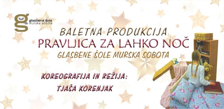 V ponedeljek, 4. aprila 2022 bodo učenke klasičnega baleta Glasbene šole Murska Sobota, pod mentorstvom režiserke in koreografinje Tjaše Korenjak zaplesale v baletni produkciji z naslovom Pravljica za lahko noč.
