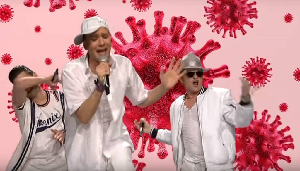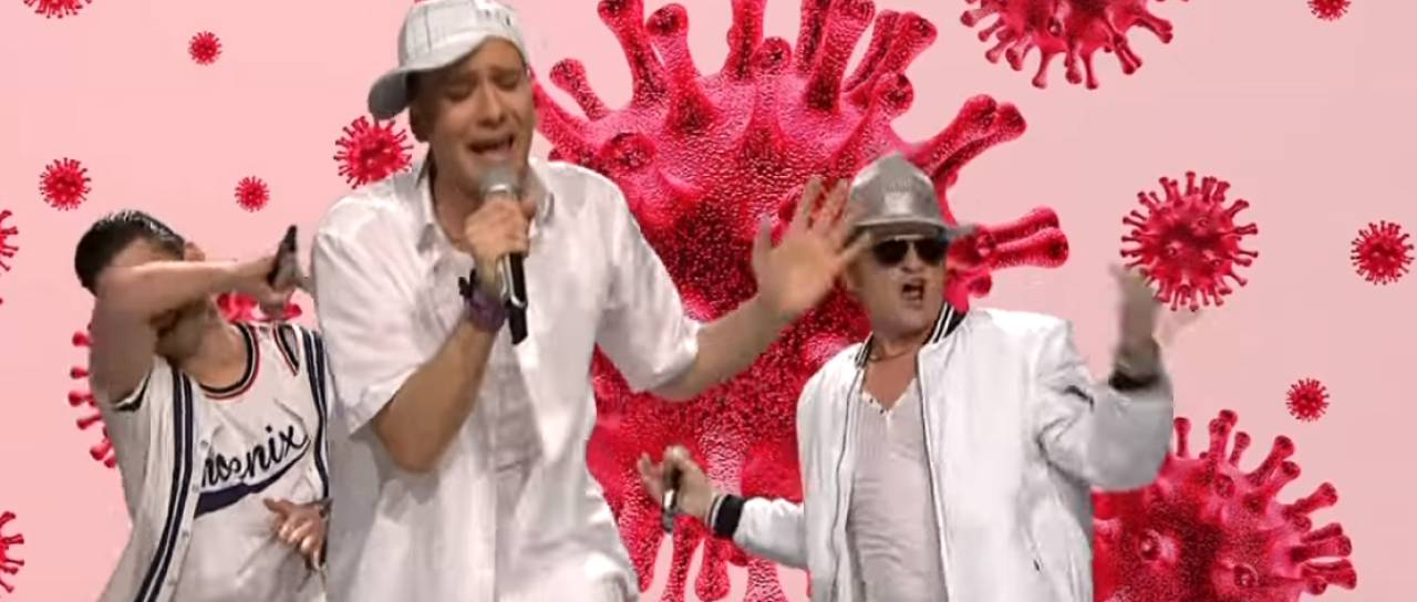 V rubriki Mala terasa satirične oddaje Kaj dogaja? Z Jonasom so se Igor Bračič, Tilen Artač in gost Klemen Slakonja z rimami lotili aktualne problematike okužb z novim koronavirusom in opozorili na pomen preventive.
