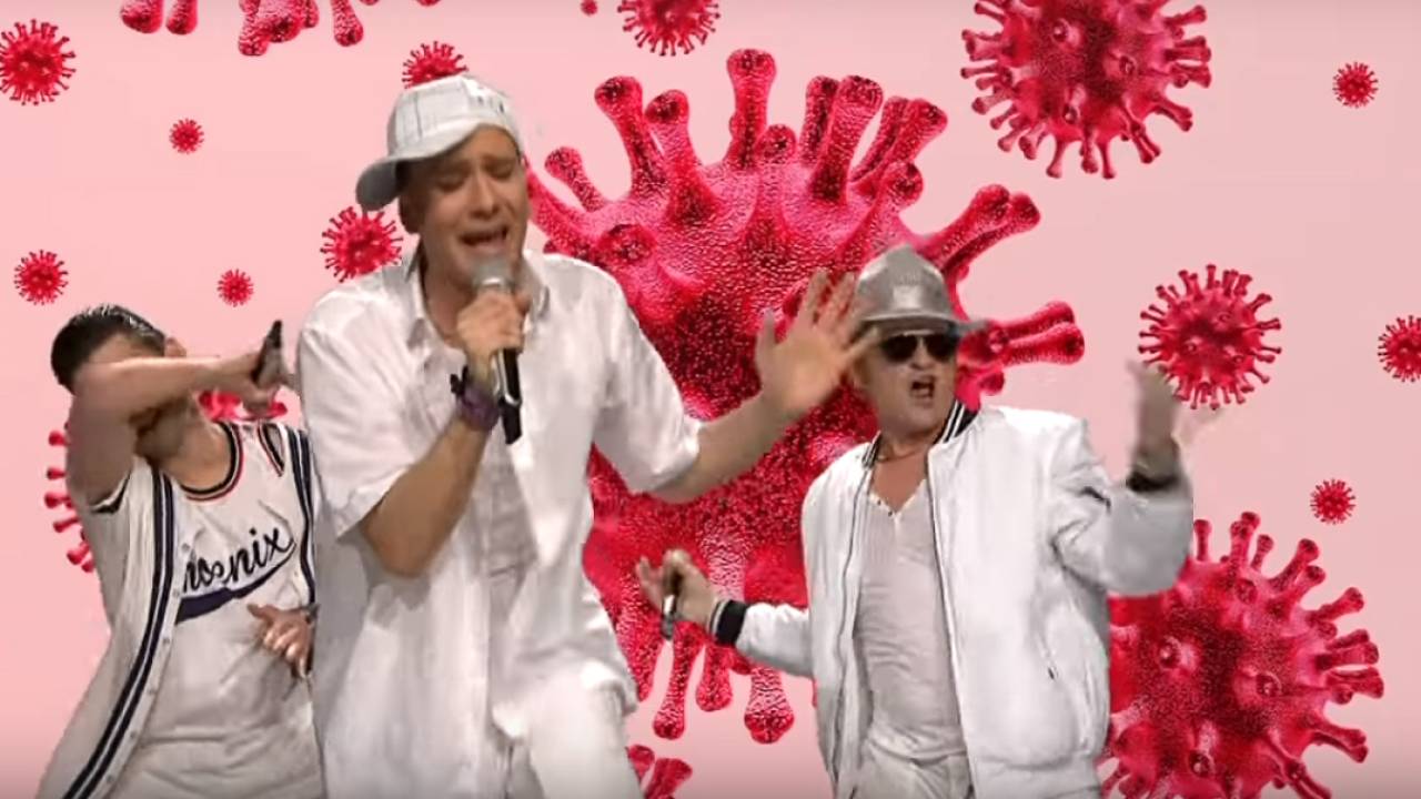 »Okužila si mene, v prsih me boli, v tebi so bili kitajski virusi,« je med drugim prepevala trojica pod imenom 'Germ Over'.