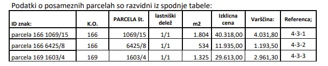 Izklicna cena za zemljišče velikosti 1324 kvadratnih metrov je določena na 22.200 evrov, izklicna cena za zemljišče velikosti 534 kvadratnih metrov pa na 8950 evrov.