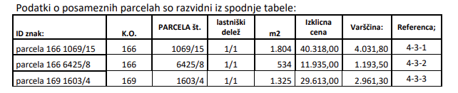 Nepremičnine se prodajajo posamezno, po izklicni ceni, navedeni v spodnji tabeli.