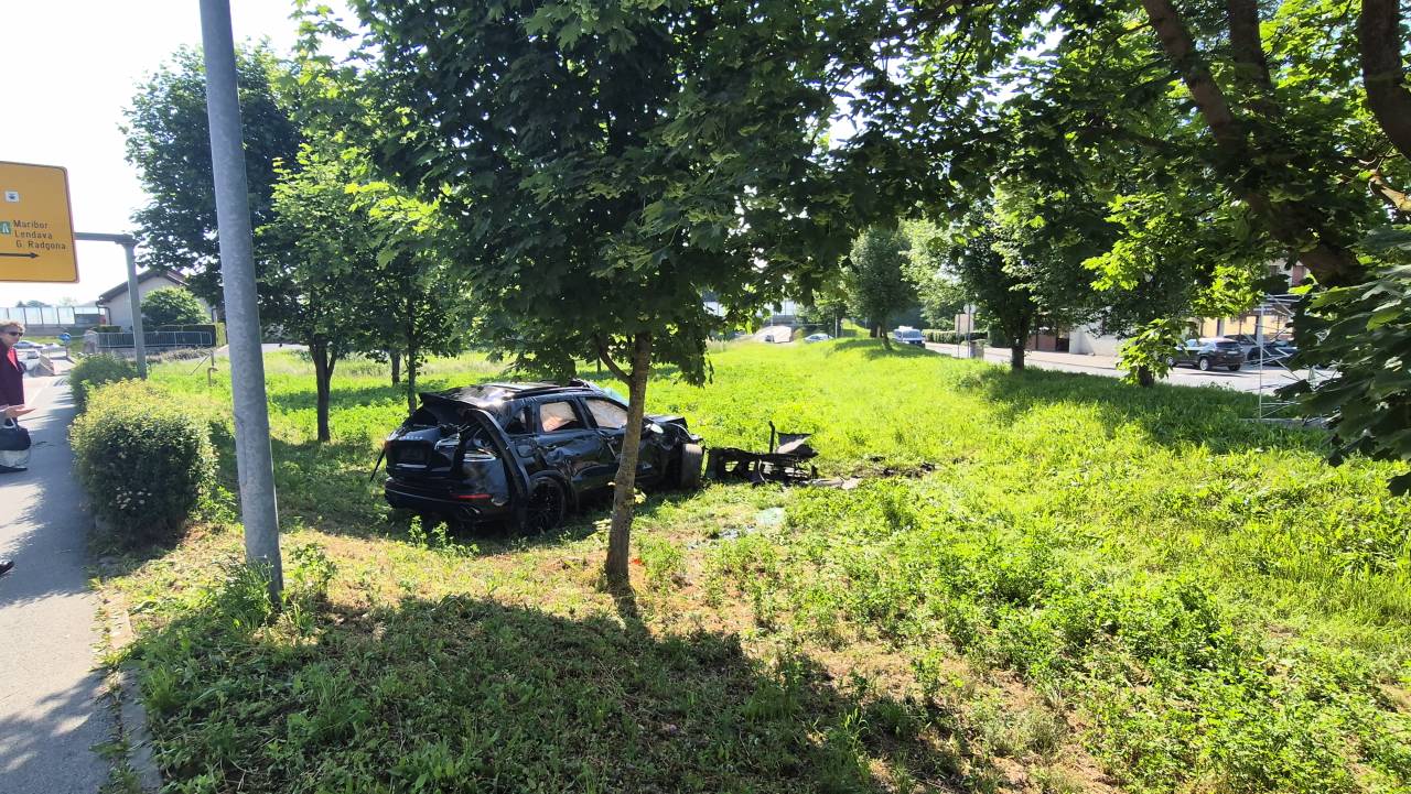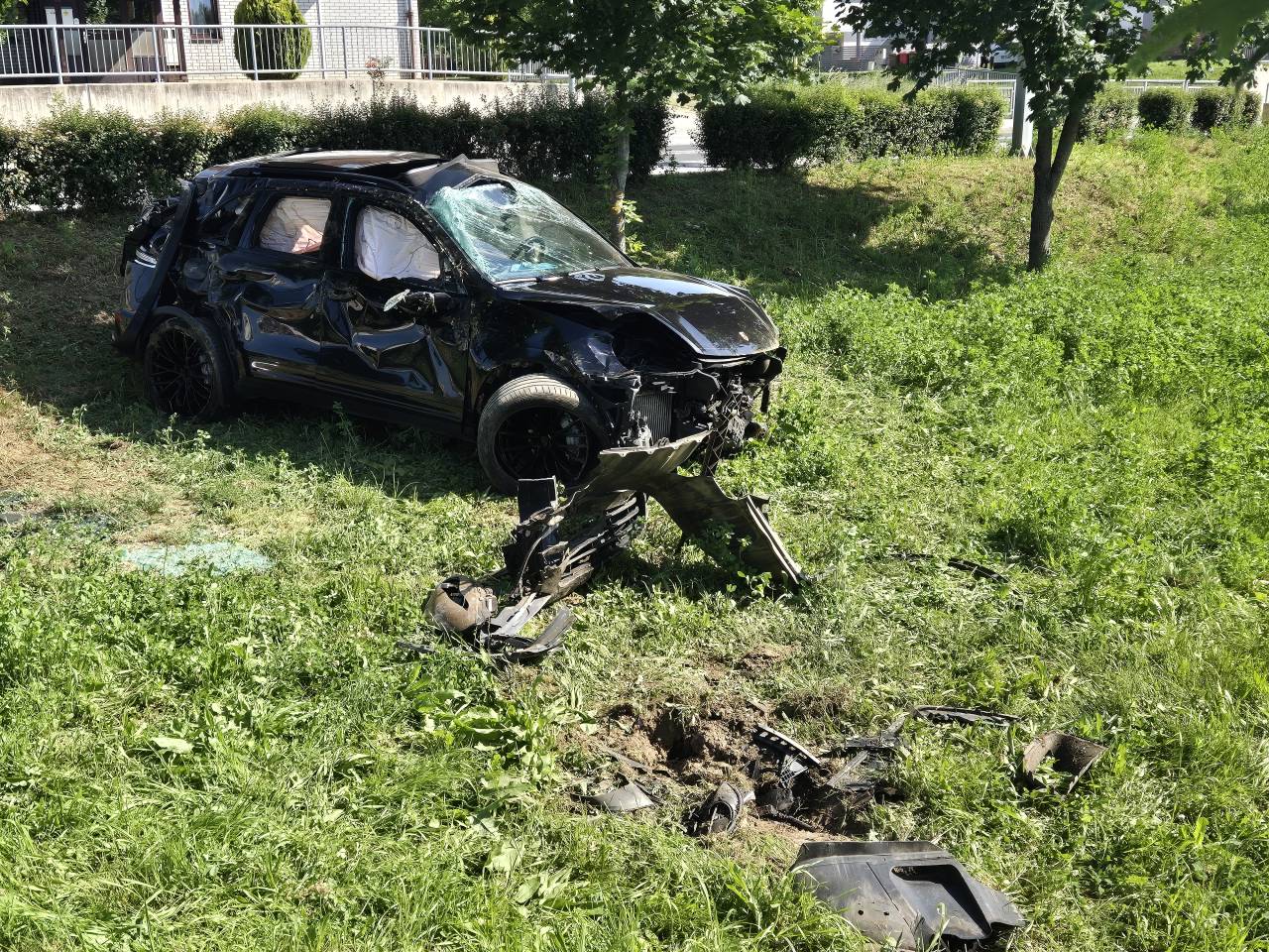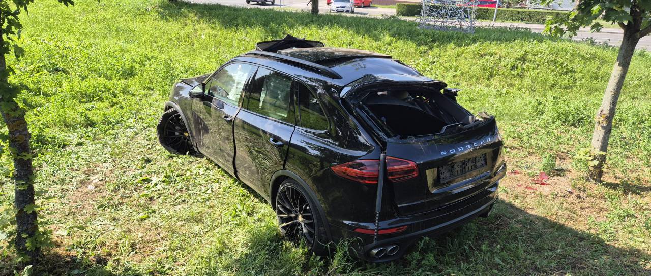 Poškodovano črno vozilo znamke Porsche, ki je ob trku pristalo na boku, še vedno leži na zelenici ob cesti.