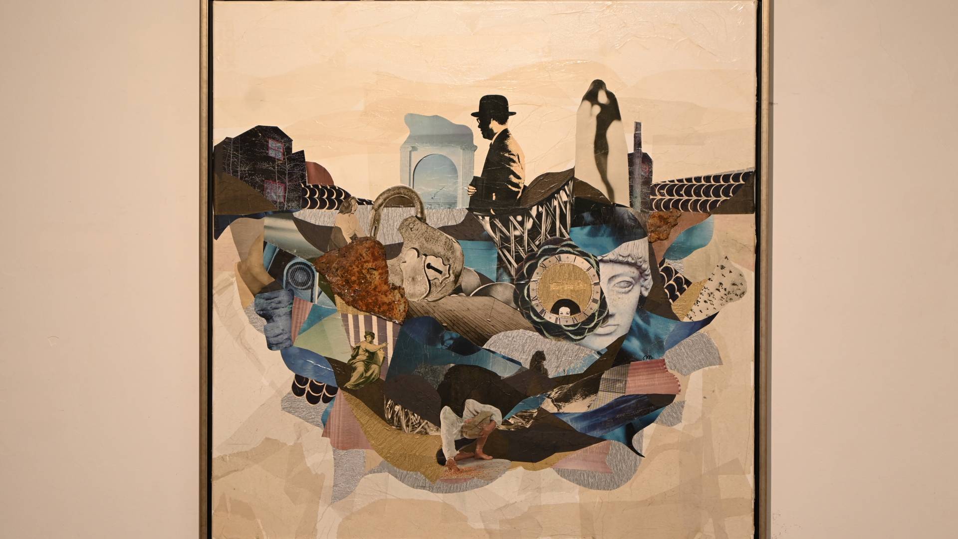 Skupna razstava treh avtorjev predstavlja premišljen umetniški dialog med kolažem, porcelanom in akvarelom.