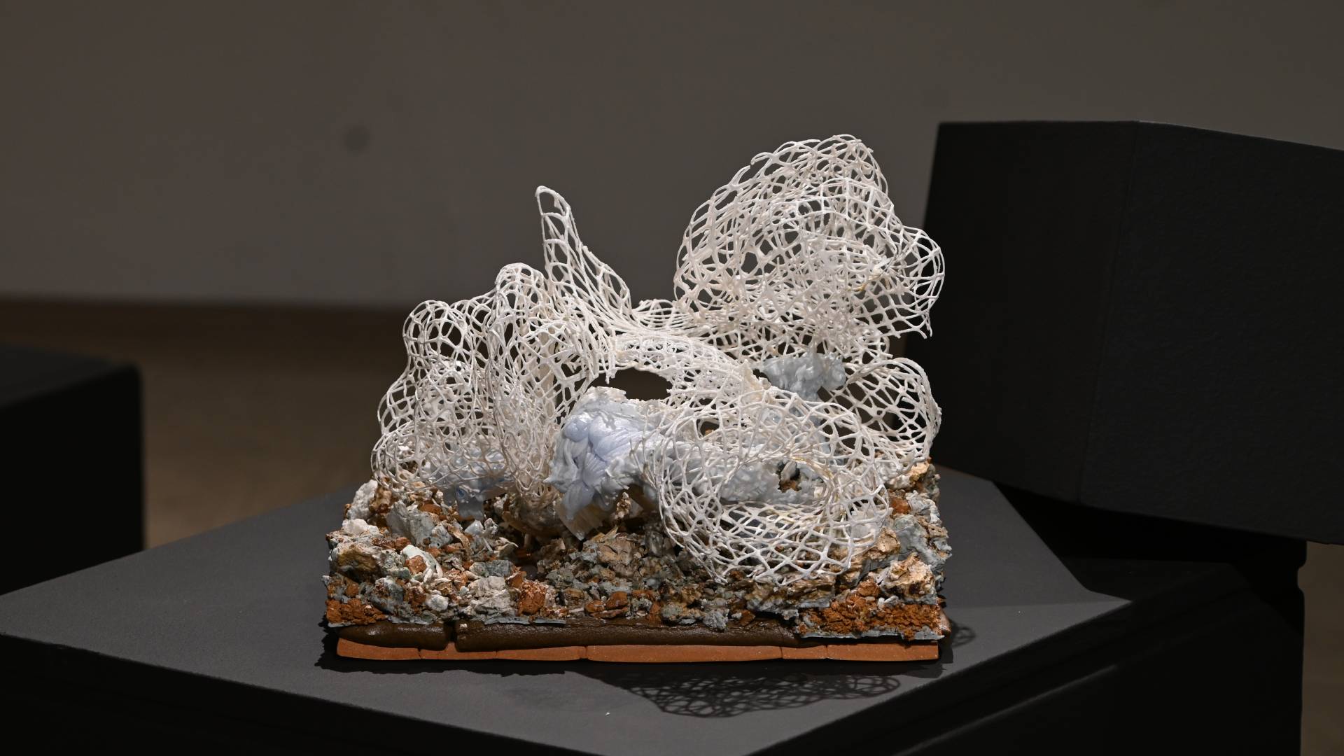 Nežna čipkasta tekstura in bele organske oblike razkrivajo tankočuten odnos do materiala, ki se izmika popolni kontroli. Ajdišek porcelan dojema kot živo snov, ki beleži čas in njegovo neizbežno razkrajanje.