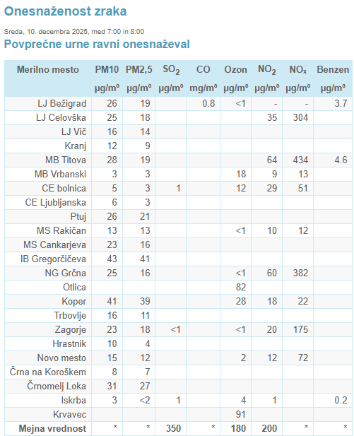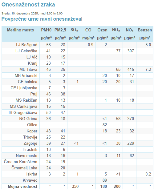 Po podatkih agencije za okolje so bile danes, 10. decembra 2025, izmerjene naslednje vrednosti delcev PM10: