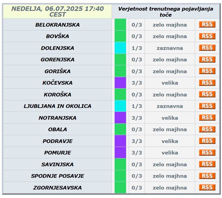 Agencija Republike Slovenije za okolje je Kočevsko, Notranjsko, Podravje in Pomurje izdala vijoličasto opozorilo za veliko verjetnost trenutnega pojavljanja toče.