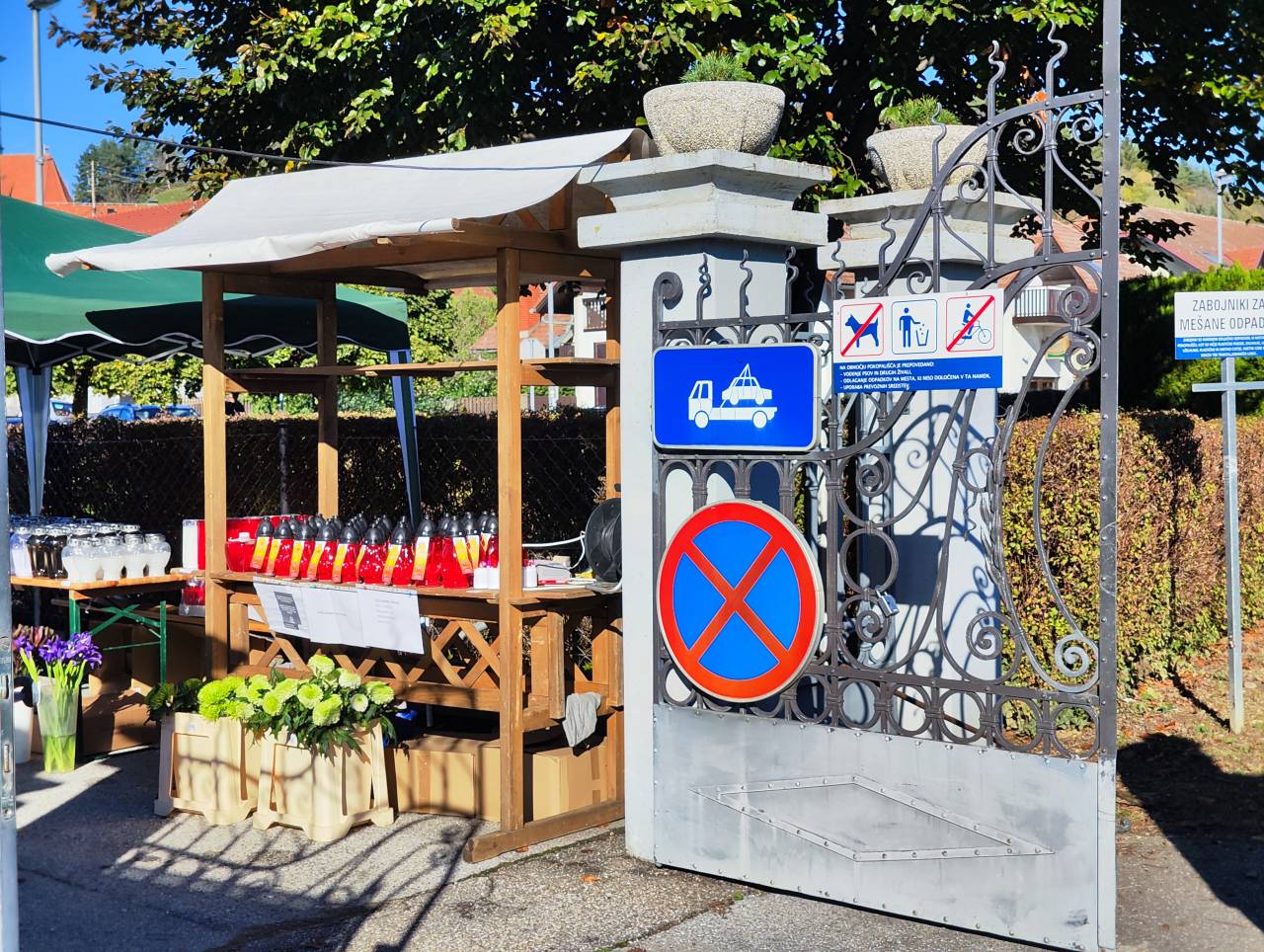 Pred večjimi pokopališči pa lahko zraven standardne ponudbe sveč in cvetja kupimo tudi sladkarije, Turški med, lizike, sladkorno peno, domače medenjake, karamelizirana jabolka, tudi kostanje …