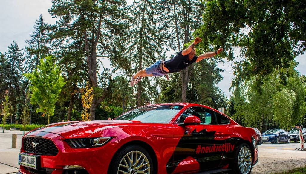 Zdaj se je odločil za nov skok, oziroma serijo le-teh. Za razliko od zadnjič tokrat ni skočil iz objekta, ampak je tega zdaj preskočil. V sodelovanju z Avto Rajh je namreč izvedel vratolomni skok preko športne ikone, Fordovega Mustanga.