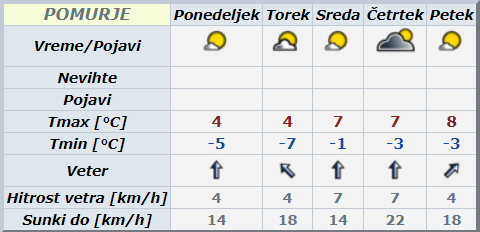 Toliko naj bi namerili tudi jutri zjutraj, a se bo že čez dan ogrelo na 4 stopinje Celzija. Temperature v prihodnjih dneh pa bodo še višje in se bodod čez dan gibale med 7 in 8 stopinj Celzija, zjutraj pa se bodo termometri spustili tri stopinje pod ničlo.