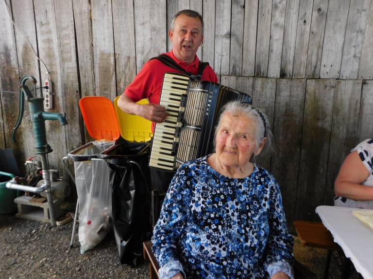 Za svoj rojstni dan je tudi nazdravila z rujno vinsko kapljico. Ves čas praznovanja je na harmoniko igral domače poskočne skladbe Franc Ritlop.