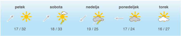Jutri bo pretežno jasno. Proti večeru bodo na severu nastale prve nevihte, ki se bodo v noči na nedeljo razširile proti jugu. Najnižje jutranje temperature bodo od 13 do 18, na Primorskem okoli 20, najvišje dnevne od 30 do 34 stopinj Celzija.