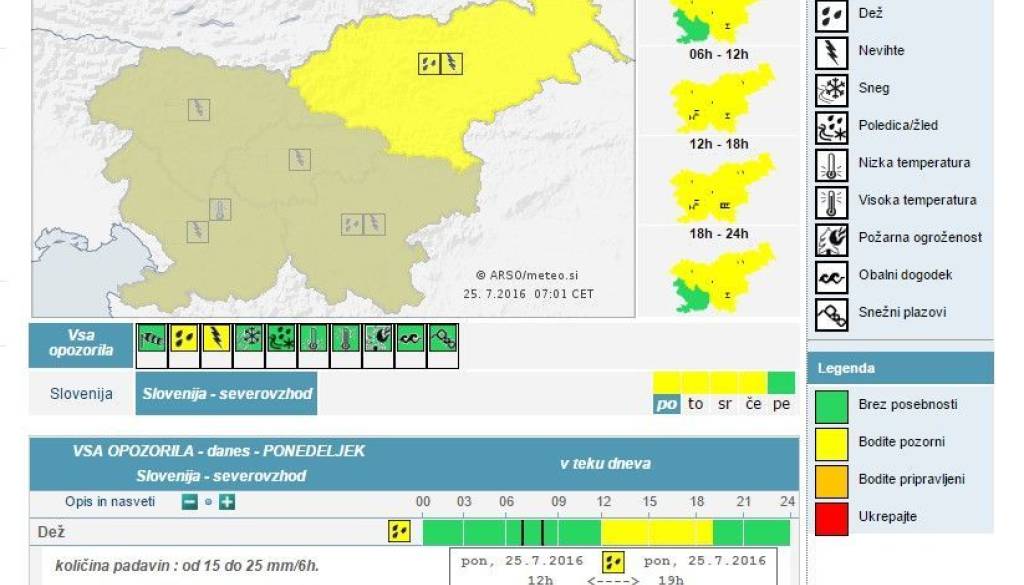 Večji del dneva so možne krajevne nevihte z močnejšimi nalivi, piš vetra in udari strel. Hitro lahko narastejo hudourniški vodotoki in se razlijejo, nastopijo lahko tudi poplave meteorne vode. ARSO je zato že izdal rumeni alarm.