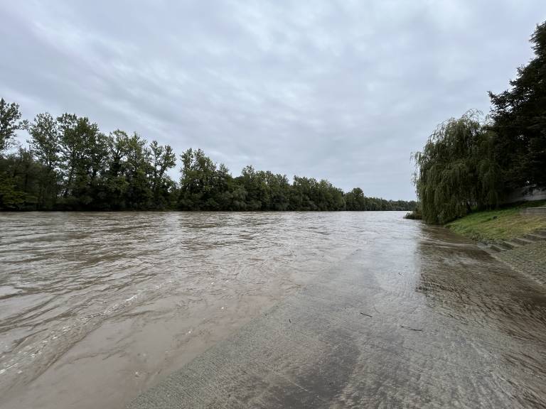 Voda blizu betonske ploščadi, a daleč od nasipov