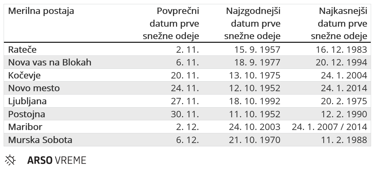 Za nekatere kraje po Sloveniji so preučili podatke prve jesenske oziroma zimske snežne odeje v preteklosti. Osredotočili so se na podatke, ko je bila višina novega snega vsaj en centimeter.