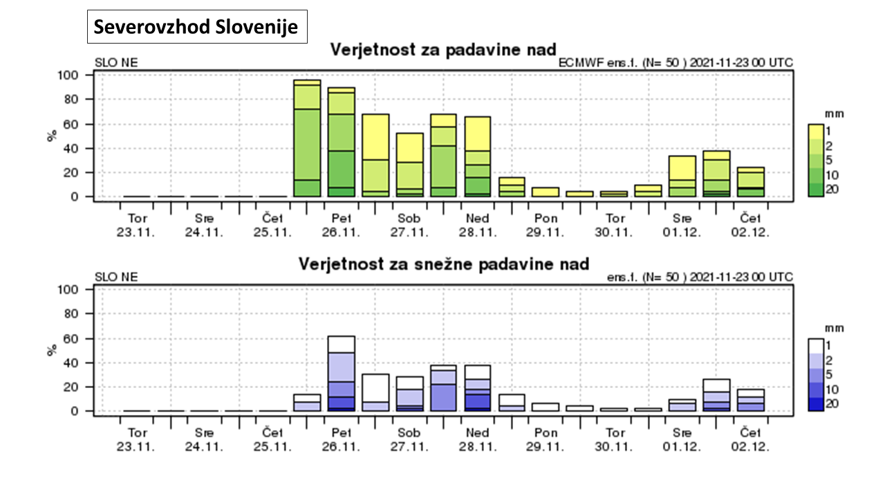Vremenoslovci pojasnjujejo, da je verjetnost padavin v severovzhodni Sloveniji nekoliko nižja (najvišja je v noči iz četrtka na petek), verjetnost za sneg pa višja kot v osrednji Sloveniji. V petek je verjetnost za sneženje celo 60-odstotna.