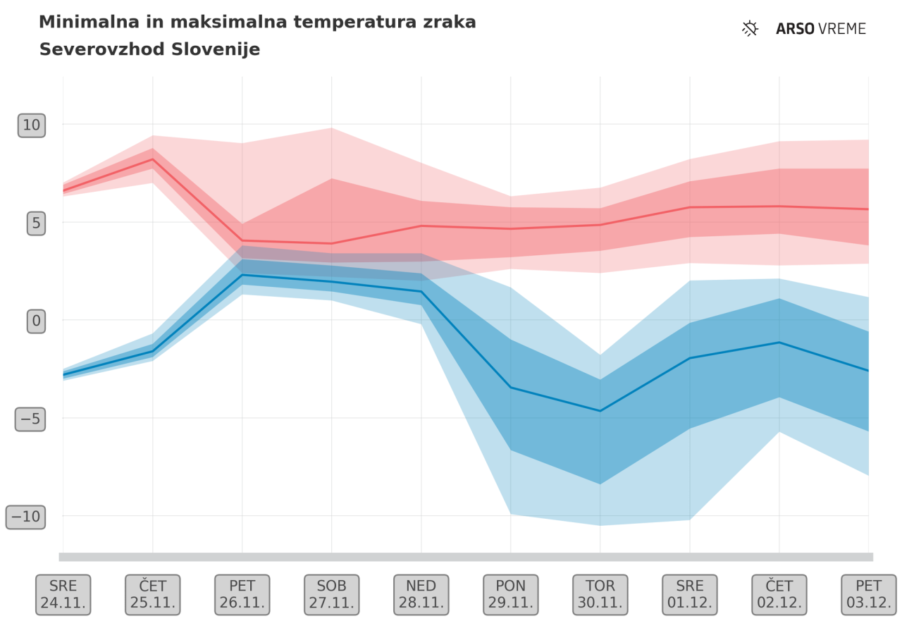 Temperature v vzhodnem delu Slovenije bodo konec tedna namreč nekoliko nižje kot v osrednji Sloveniji, vendar pa bodo po besedah vremenoslovcev ravno na meji za sneg.