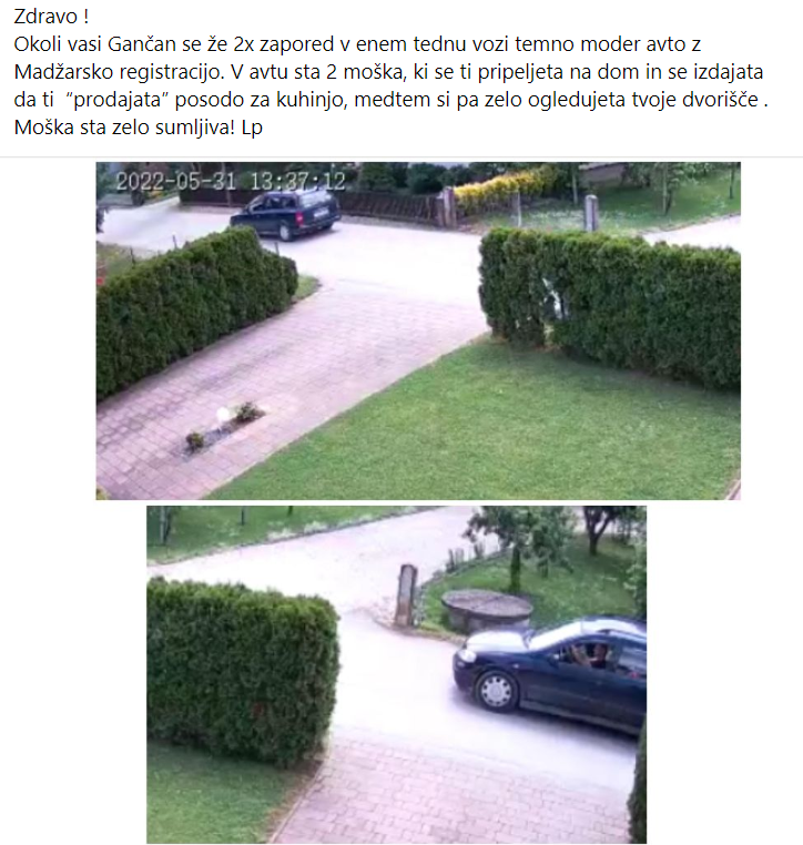 »Avto je bil temno modre barve z madžarsko registracijo, v njem sta bila dva moška, ki sta bila zelo sumljiva. Pripeljala sta se k sosedom na dom ter jih spraševala, če imajo kaj takega, da bi jim lahko dali. Prav tako sta prodajala posodo za kuhinjo, ki pa je ni bilo videti.