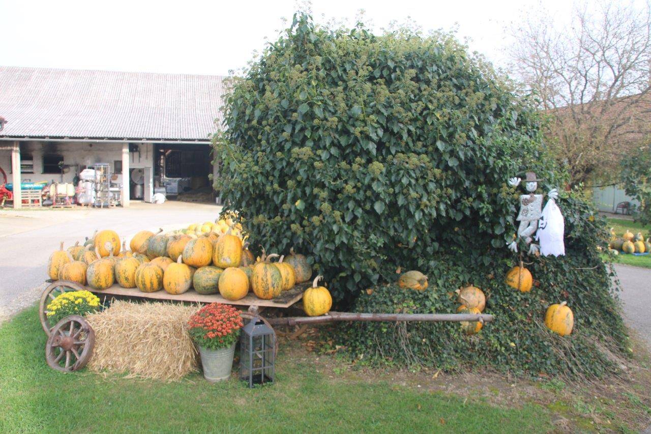 Poleg številnih likov, ki krasijo razstavo, imajo pomembno vlogo domače buče, pridelane na kmetiji.