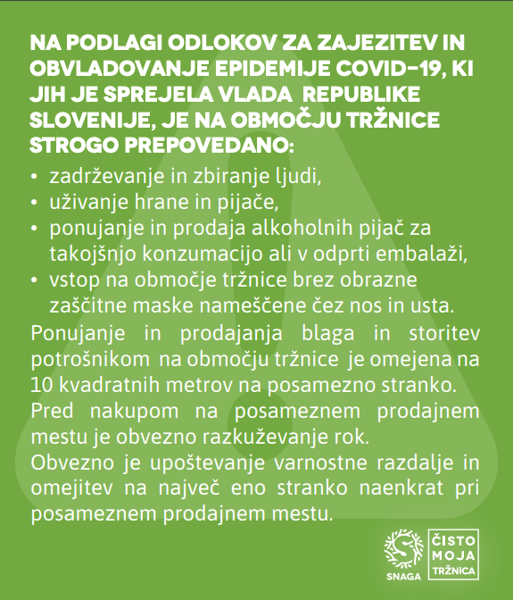 Na darilni tržnici je prepovedana prodaja kakršne koli pijače v odprti embalaži, za takojšnjo konzumacijo. Nadzor nad izvajanjem bo vršil dnevno prisoten reditelj Snage v skladu z veljavnimi ukrepi za zajezitev preprečevanje okužbe s covid-19.