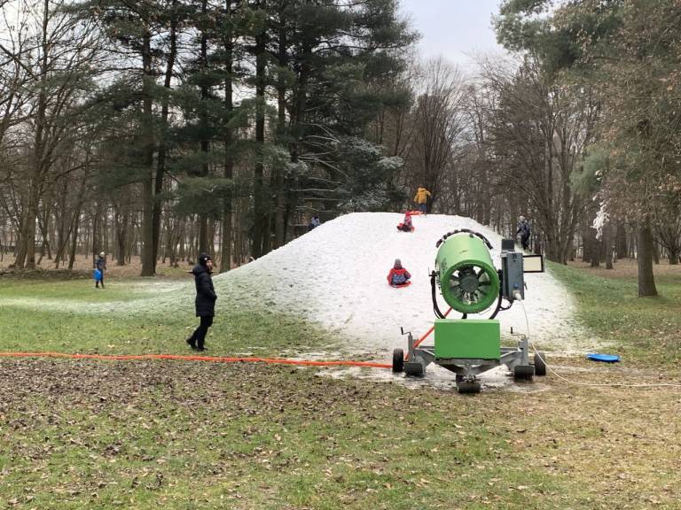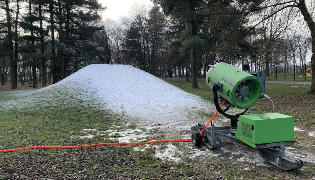 Ker so zimske počitnice v začetku tega leta minile brez snežne odeje, so v Beltincih uporabili snežni top, ki je v parku pri beltinškem gradu mlajšim in tudi malo starejšim omogočil igrive radosti na umetnem snegu.