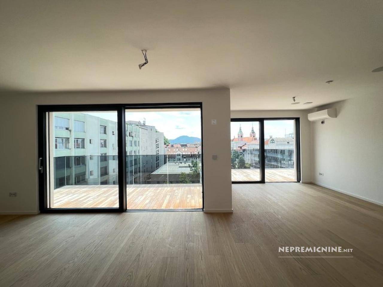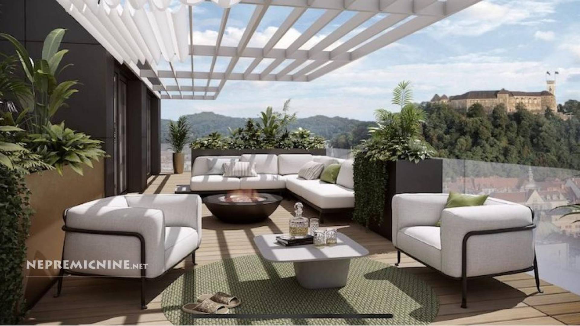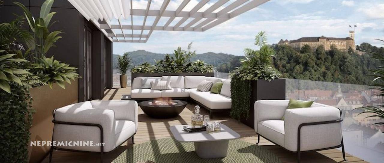 Stanovanje v šestem nadstropju je ogromno; ima šest sob in meri kar 390 kvadratnih metrov. Posebej velika je terasa – ponaša se s skoraj 100 kvadrati površine, s katere je razgled na Ljubljanski grad.