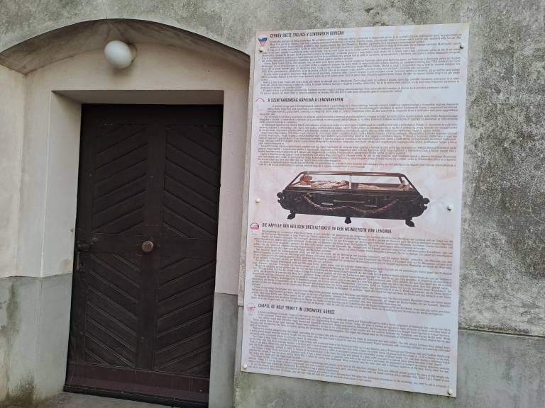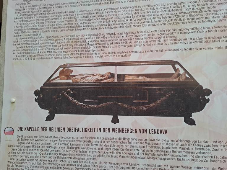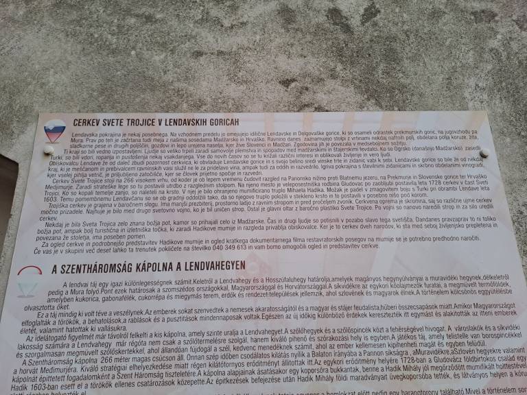 Mumija, legenda in razgled. Cerkev Svete Trojice se dviga na slikovitem griču nad Lendavo, obdana z vinogradi v naselju Lendavske Gorice.