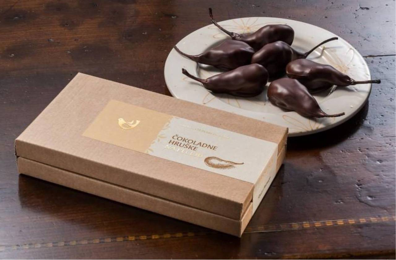Tukaj so tudi Čokoladne hruške na peclju – sušena hruška vse do peclja potopljena v dišečo temno čokolado.