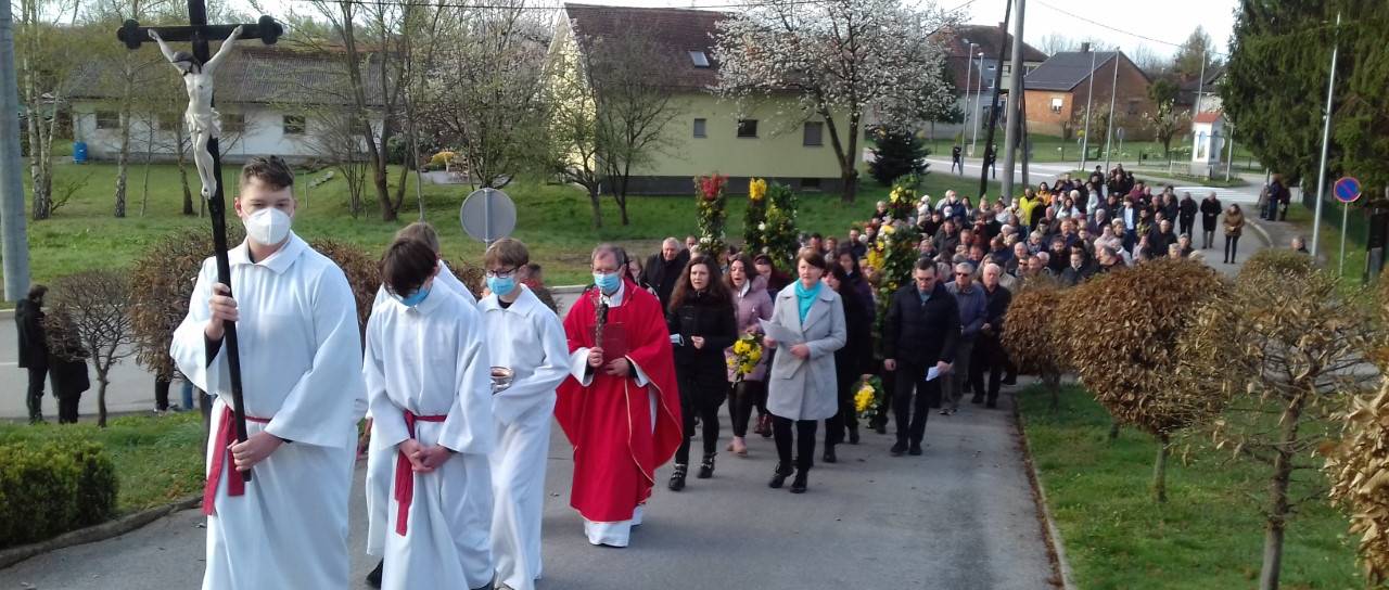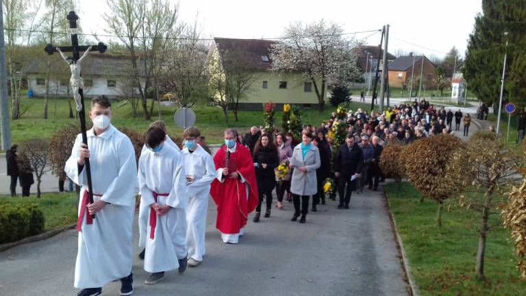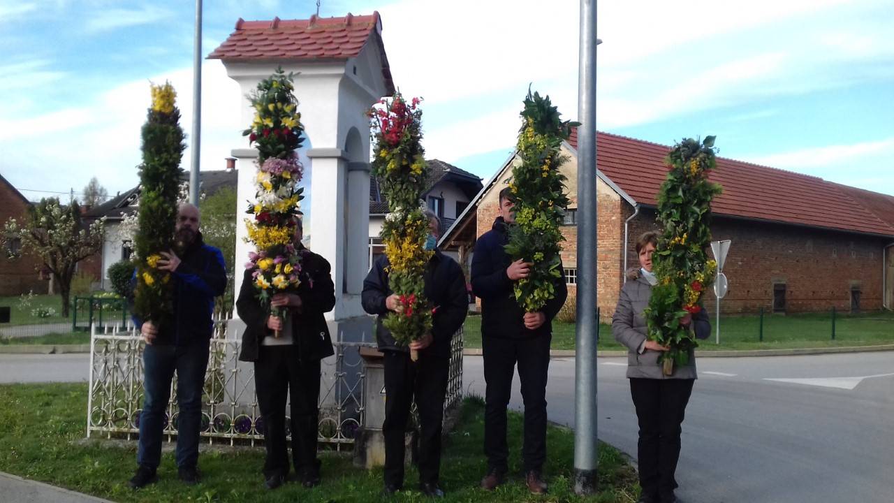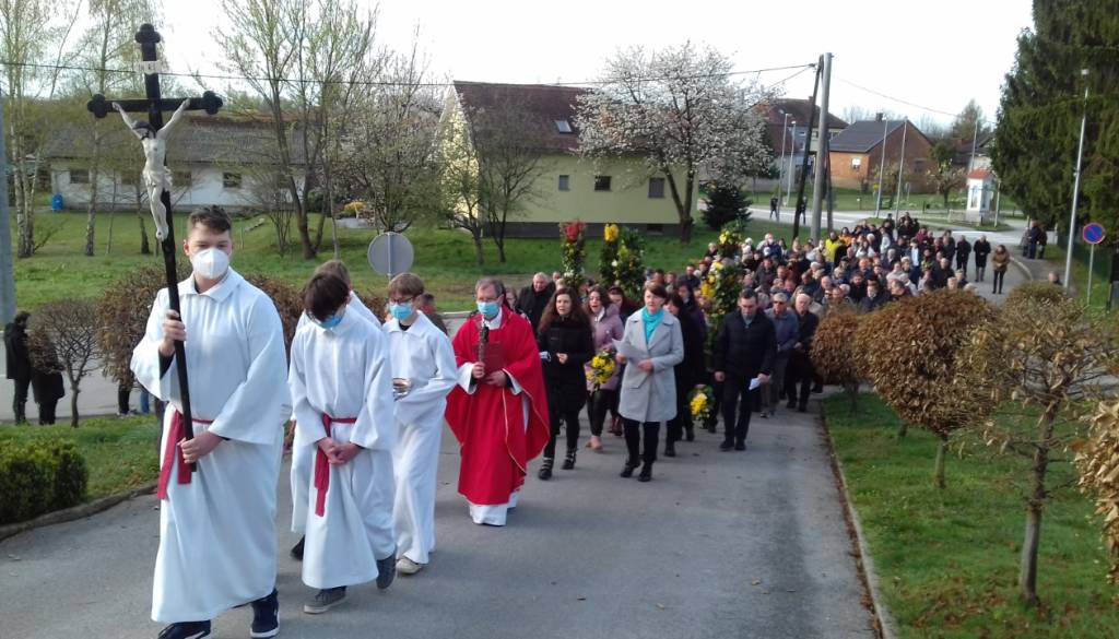 Pletene presmece so nato na cvetno nedeljo verniki položili ob nabožnem znamenju ter jih po blagoslovu v procesiji odnesli do vrat župnijske cerkve, kjer so jih potem namestili v posebna stojala.