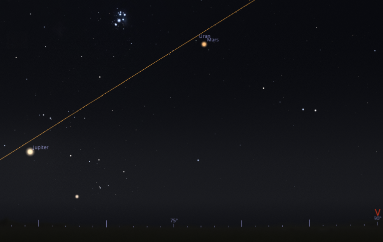 Gradišnik razlaga, da bosta v noči na torek in sredo približno dve uri pred vzhodom Sonca, okrog 3. ure, planeta Uran in Mars zelo blizu skupaj.