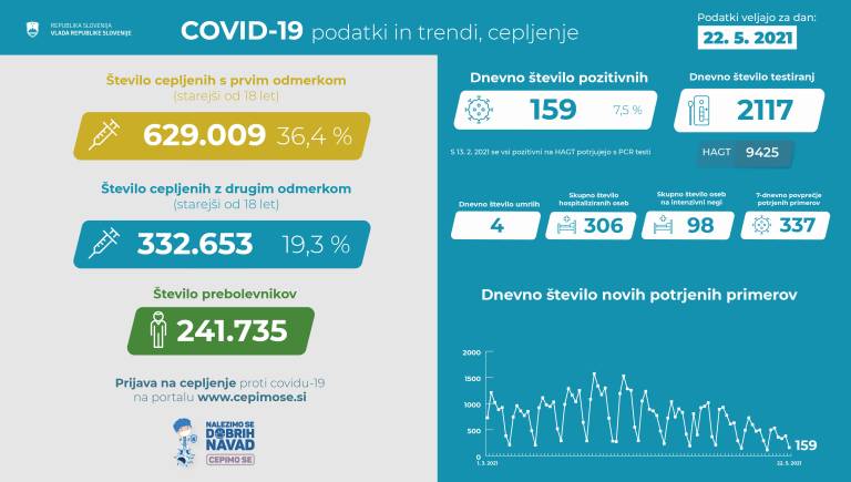 V Sloveniji so včeraj, 22. maja, opravili 2117 PCR testiranj na koronavirus in potrdili 159 novih okužb, gre za 7,5-odstotni delež okužb.