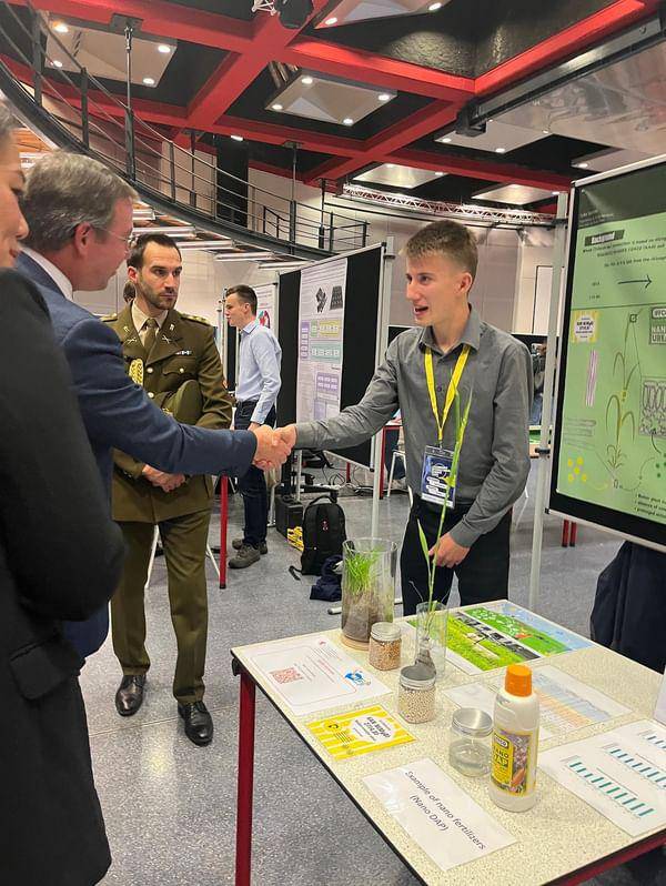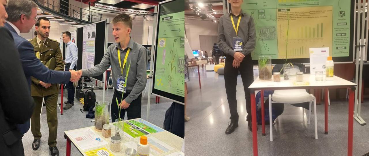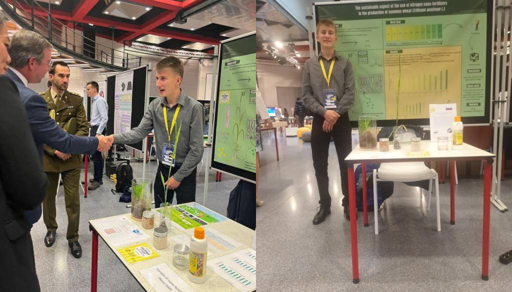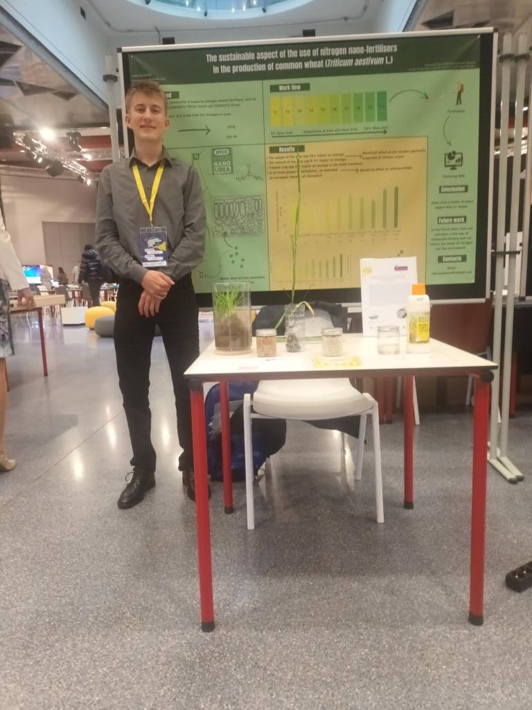 Predstavil se je s svojo raziskovalno nalogo z naslovom 'Trajnostni vidik uporabe dušikovih nano gnojil pri pridelavi navadne pšenice'.