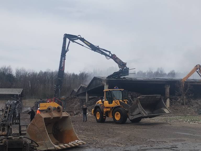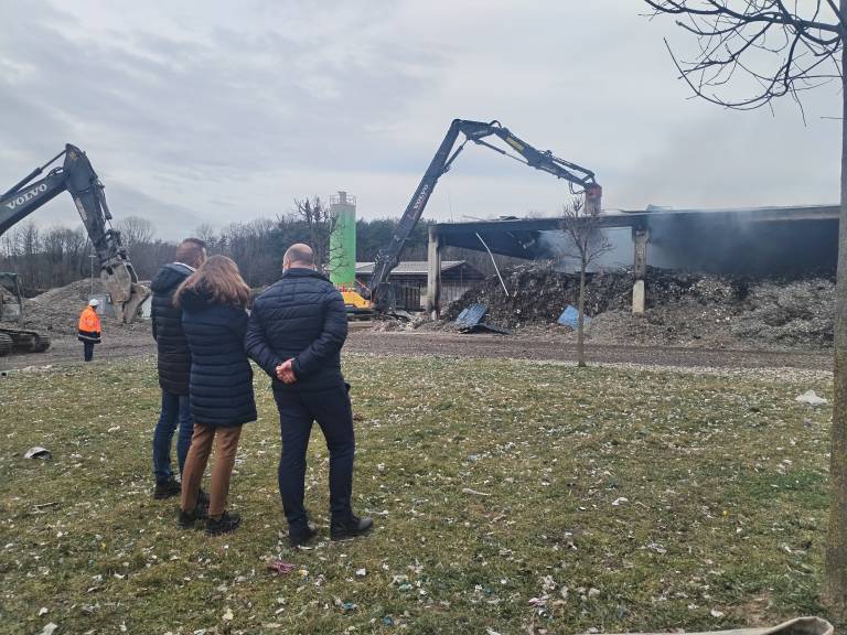 Zaradi nedostopnosti nekaterih žarišč in varnosti pri gašenju so morali začeti z rušenjem objekta, pod katerim je nakopičenih približno 3000 ton zmletih mešanih komunalnih odpadkov.