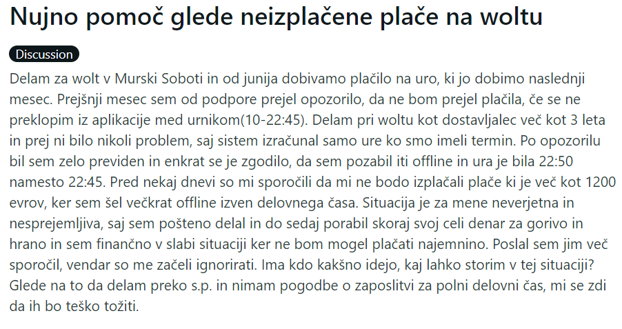 Anonimni zapis dostavljavca, ki dela za podjetje Wolt v Murski Soboti, na Redditu trdi, da je od podpore prejel opozorilo, da »ne bo prejel plačila, če se ne preklopi iz aplikacije med urnikom«.